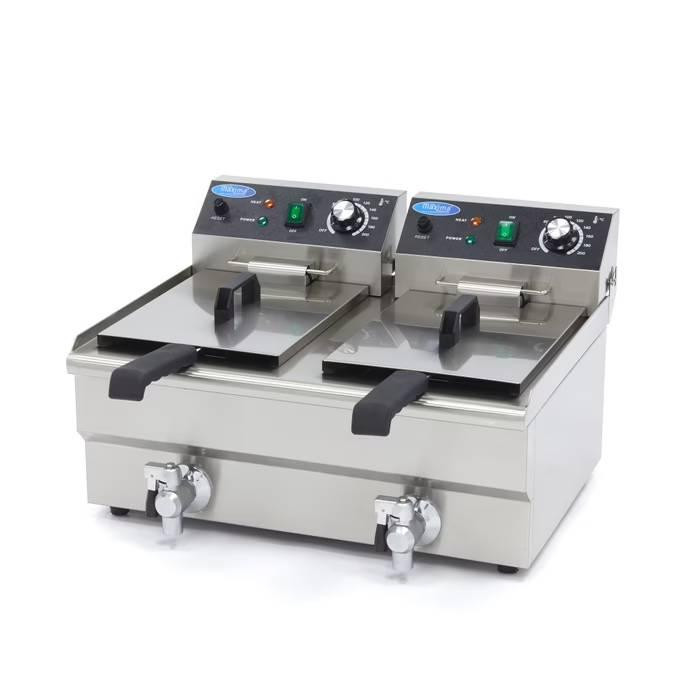 S touto profesionálnou fritézou s objemom dvoch 10 litrov môžete jednoducho a rýchlo vyprážať lahodné hranolky a chrumkavé občerstvenie. Vďaka dvojitej fritéze môžete ušetriť čas, takže zákazníci nemusia na svoje jedlo dlho čakať. Fritéza je tiež vybavená vypúšťacím kohútikom, vďaka ktorému je výmena oleja rýchla a pohodlná. Pri fritovaní často vznikajú omrvinky, ktoré klesajú na dno. Odnímateľná mriežka zaisťuje, že zvyšky jedla neucpávajú odtok. Na výmenu oleja stačí veľká nádoba, ktorú umiestnite pod vypúšťací kohútik. Potom jednoducho otvorte kohútik a nechajte starý olej vytiecť do nádoby. Keď je fritéza prázdna, môžete kohútik opäť zavrieť.